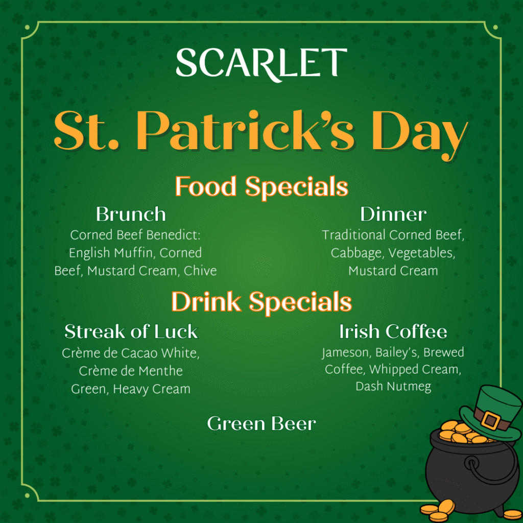 Mark your calendars and book your table now for St. Patrick’s Day, March 17th, at Scarlet! Join us for brunch from 7:00am-3:00pm and dinner from 3:00pm-10:00pm. Reserve your table now […]